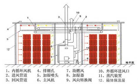 1.設備上配有蒸汽發生裝置(可產生大量的常壓蒸汽)、助氧風閥、回風閥、排潮系統等。二、RZH型磚混木材烘干設備原理:
